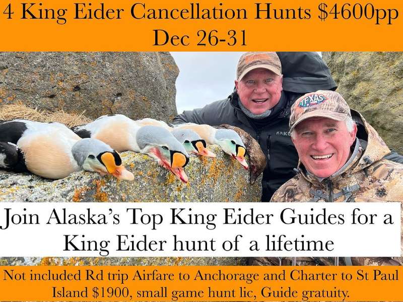Chase legendary King Eiders, Pacific Eiders, and Emperor Geese in Alaska. Explore prime hunting grounds like Island X, Volcano Bay & Cold Bay with expert guides. Experience the thrill of the hunt. Book your adventure today!