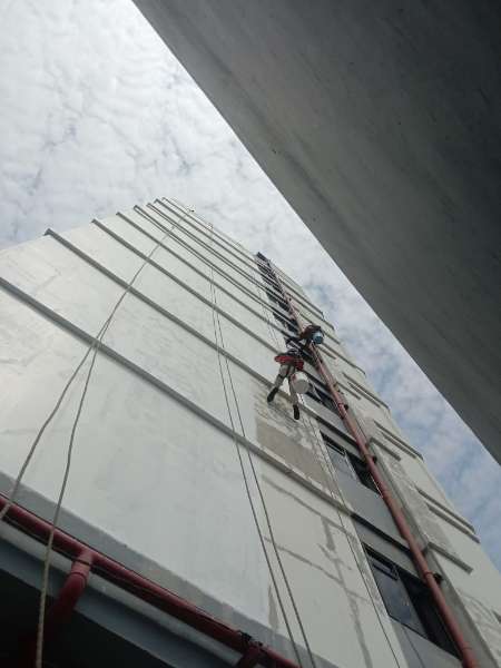 Facade Cleaning merupakan kegiatan membersihkan luar bangunan gedung agar tetap bersih dari debu, polutan dan kotoran yang menempel pada bangunan sehingga perlu perawatan khusus.