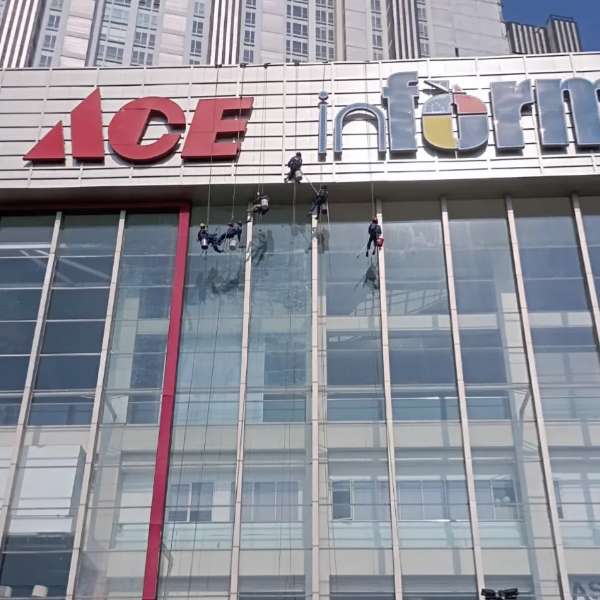 Facade Cleaning merupakan kegiatan membersihkan luar bangunan gedung agar tetap bersih dari debu, polutan dan kotoran yang menempel pada bangunan sehingga perlu perawatan khusus.