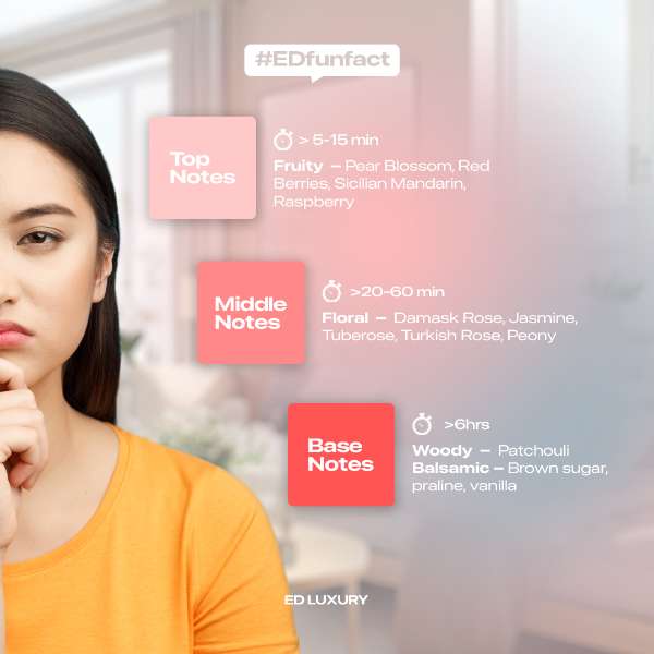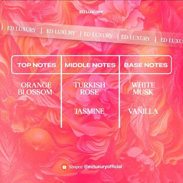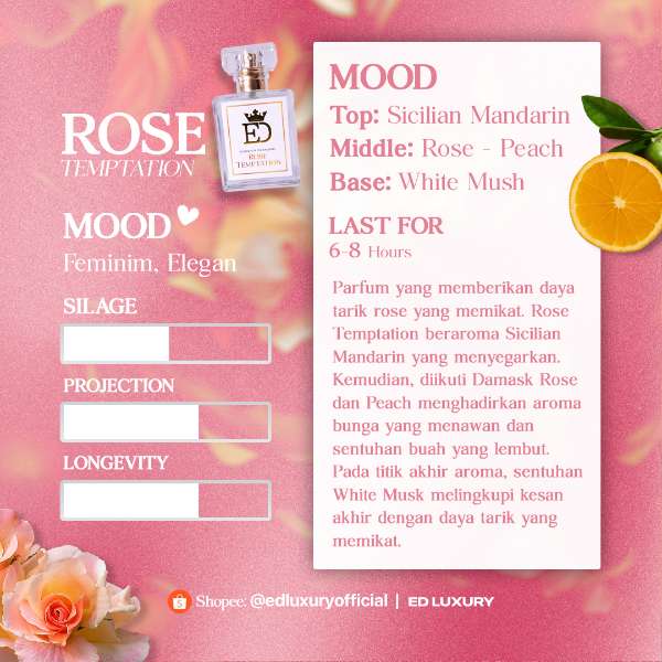 Rose Temptation dari ED Luxury menggabungkan aroma segarnya sicilian mandarin, sentuhan lembutnya aroma damask rose dan ditutup dengan white musk yang memberikan aroma memikat dan cocok di segala kondisi.