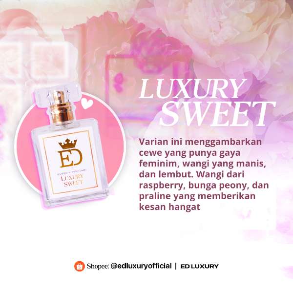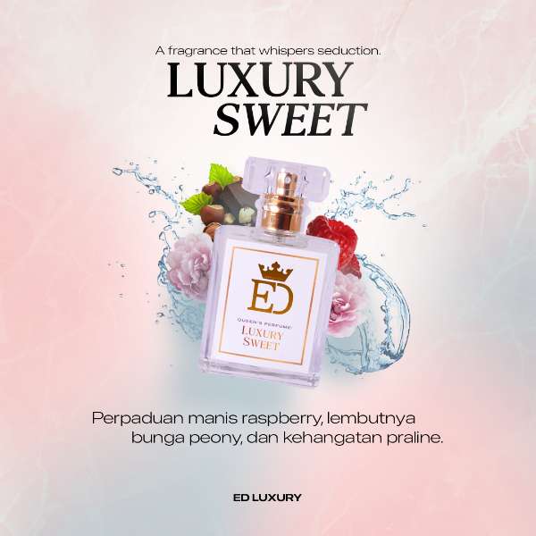 Luxury Sweet dari ED Luxury menggabungkan kesegaran buah raspberry, keanggunan bunga peony, dan kehangatan aroma praline. Setiap semprotan menciptakan keharmonisan wangi yang manis dan memikat.