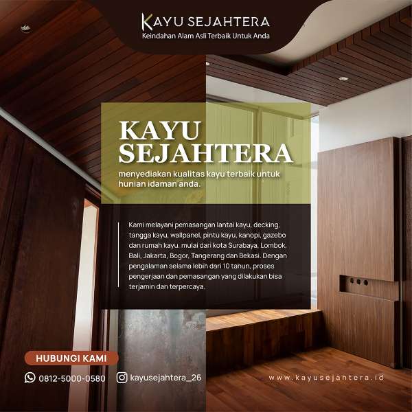 Kayu Sejahtera adalah perusahaan yang mengkhususkan diri dalam bidang Wood Working dan memberikan layanan untuk memenuhi berbagai kebutuhan kayu di wilayah Surabaya, Lombok, Bali, Jakarta, Bogor, Tangerang, dan Bekasi. Kami menggunakan produk kayu lokal berkualitas tinggi dan menyediakan berbagai jenis pemasangan kayu seperti lantai, decking, tangga, wallpanel, pintu, kanopi, gazebo, dan bahkan rumah kayu. Dengan pengalaman selama lebih dari 10 tahun, pelanggan kami dapat mempercayakan proses pengerjaan dan pemasangan pada tim kami yang profesional dan terampil.
