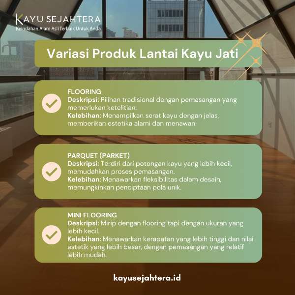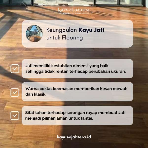 Temukan keunggulan luar biasa dari lantai kayu jati! Dengan kekuatan dan daya tahan yang tak tertandingi, kayu jati merupakan pilihan ideal untuk penggunaan jangka panjang | Kayu Sejahtera Woodworking