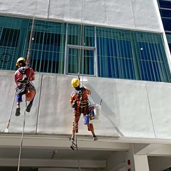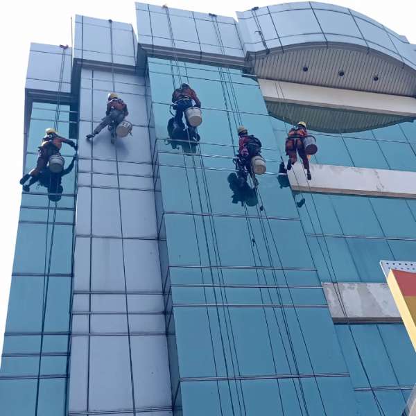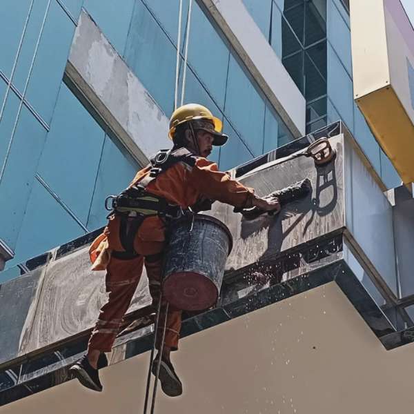 Facade Cleaning merupakan kegiatan membersihkan luar bangunan gedung agar tetap bersih dari debu, polutan dan kotoran yang menempel pada bangunan sehingga perlu perawatan khusus.