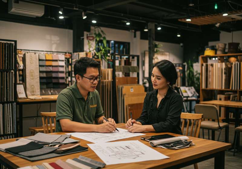 Konsultasi desain furnitur custom untuk kafe di showroom Melati Indah Malang, layanan profesional dan personal