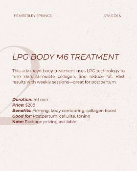Explore our advanced, non-invasive treatments at Pemberley Springs. LPG Endermologie facials for smooth, firm skin and long-lasting results. Book today!