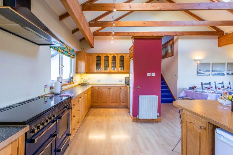 The solid oak kitchen in this self-catering villa in Scotland is open-plan and fully equipped with modern amenities, including a double-oven range cooker, large gas range, hot plates, extractor, combination microwave, dishwasher, and freezer-fridge. Everything you need for a comfortable stay is provided in this well-appointed holiday rental.