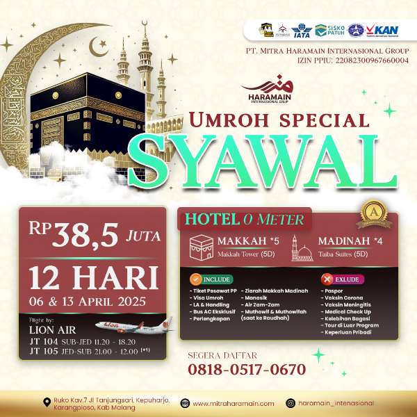 Ikuti Paket Umroh Spesial Maulid Nabi 12 Hari. Akomodasi bintang 5, penerbangan langsung, keberangkatan 07 September 2025. Harga Rp 36,5 juta, terbatas 35 seat.