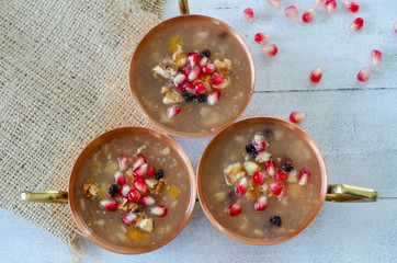 The Asure is a rich pudding prepared with pulses like barley, navy beans, and chickpeas that are frequently made with a religious connotation to commemorate the ark's landing. On cold evenings, this rich pudding is the ideal dessert for sustenance.