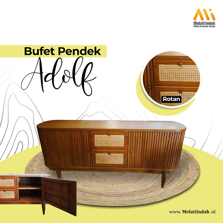 Bufet pendek minimalis modern terbaru Adolf dirancang untuk mereka yang menyukai kesan segerhana dan elagan. Dengan tiga sekat dan dua laci di sekat tengah, bufet ini menawarkan ruang penyimpanan yang cukup. Paduan rotan pada desainnya menambahkan tekstur klasik, menjadikannya pilihan yang tepat untuk menambahkan karakter ke dalam ruangan ruamh tamu rumah Anda.