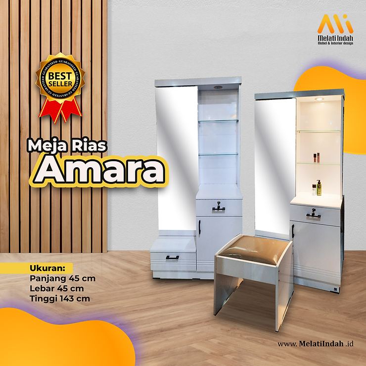 "Amara," meja rias minimalis modern kami, memadukan solusi yang berdandan dengan setengah badan maupun seluruh badan untuk kebutuhan berhias Anda. Meja rias ini dilengkapi dengan cermin yang tinggi lengkap dengan kursinya. Finishing minimalis berwarna putih dengan detail hitam memberikan kesan sederhana elegan dan luas namun tidak memakan ruang.