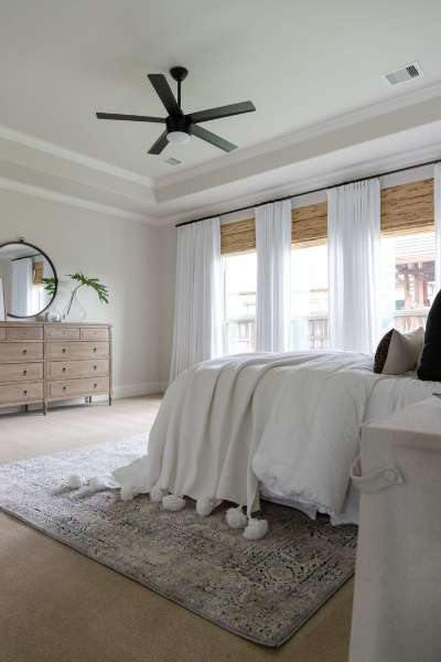 However, in a large bedroom, it might make better sense to position the ceiling fan over the bed to ensure relief on our hot summer nights.