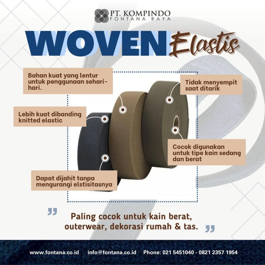 Woven elastic adalah bahan yang memiliki kemampuan untuk meregang dan kembali ke bentuk aslinya setelah ditarik atau diberikan tekanan. Ini menjadikannya solusi yang ideal untuk berbagai keperluan yang membutuhkan fleksibilitas dan kekuatan. Woven elastic seringkali terbuat dari bahan karet, baik alami maupun sintetis. Keunggulan utama dari woven elastic adalah kemampuannya untuk memberikan kenyamanan, kefittingan yang baik, serta daya tahan yang luar biasa.